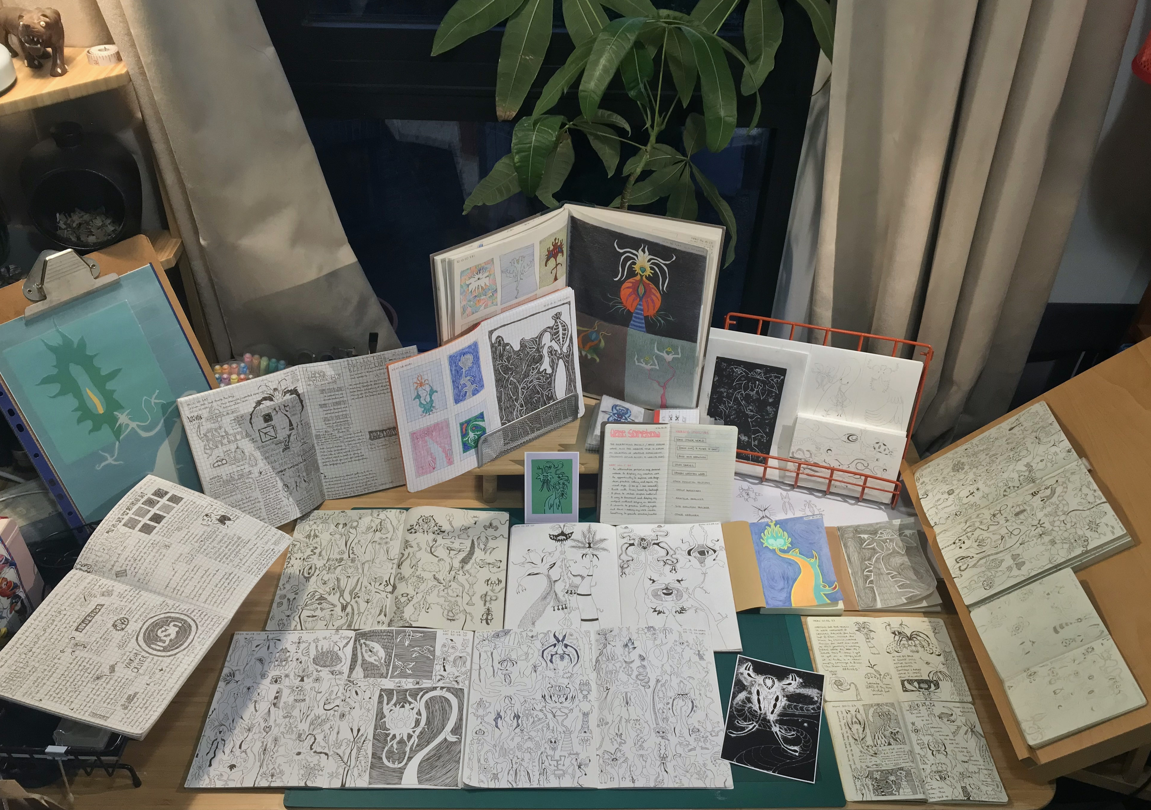As I've worked to re-establish a creative practice over the past few years following a rocky experience of studying art, the core of it has centred on an ongoing collection of drawings I refer to under the project title 'Some Other World'. The act of navigating this creative process itself has remained so prominent that my aims for the project now include incorporating aspects of that contextually. This is the main thing I intend to build towards presenting but is still very much in progress, so for now here's a photo overview of some of my related sketchbooks and such.
